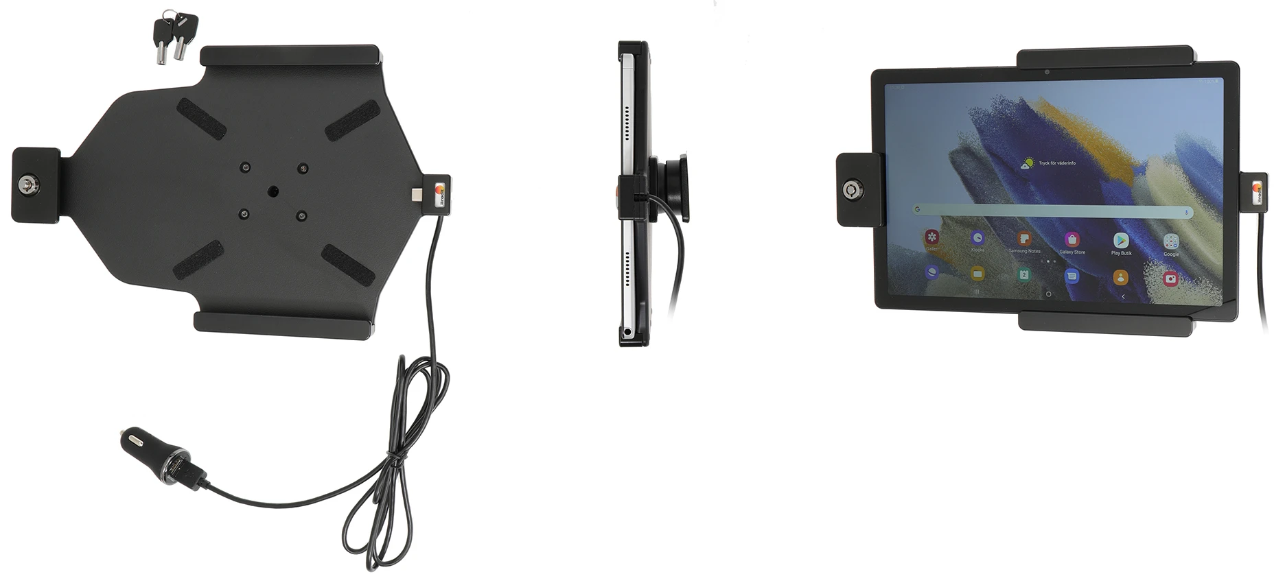 An installation of a tablet onto a vehicle’s dashboard is always done on the customer’s own responsibility. Brodit recommends to use tablets on a Pedestal mount or a Brodit headrest mount.