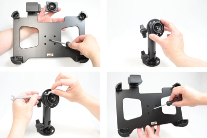 Loosen the screw in the center of the holder so you can remove the tilt swivel attaching plate on the back. Place the attaching plate onto the desired position. Screw the attaching plate into place with the enclosed screws. Place the holder over the attaching plate so the screw fits in the hole in the tilt swivel. Tighten the screw until the holder is firmly in place, but still can be adjusted.