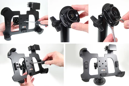 The holder is equipped with a tilt swivel so you can easily adjust the angle for better viewing, or switch between portrait and landscape mode. Tilts 15° and swivels 360°. Mounting plate 42x50 mm with predrilled AMPS-holes. Made in Sweden. Made of high grade ABS and Acetal plastic. Color: Black. Devices should not be installed onto a vehicle's dashboard if blocking the view or key controls. An installation of a device in a vehicle is always done on the customer's own responsibility.