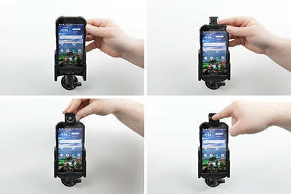 To place the device in the holder: Place the device over the holder and slide it straight downward into the holder. Slide the lock block donwward into place on top of the holder. Press the button to lock.