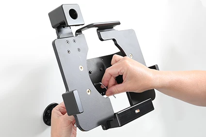 To remove the device from the holder: Use the enclosed key to open the lock. Slide the lock upward. Press upwards on the upper part of the holder, in the same time pull the upper part of the device out from the holder and then lift the device up and out from the holder.