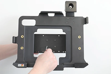 Attach the cradle onto any flat surface or Pedestal Mount in a forklift, truck, distribution vehicle, warehouse, table top etc. Backplate made of steel with 4 mm AMPS and 4 mm VESA 75 standard holes. Made of high grade ABS-, Acetal-plastic and metal. Color: Black. Made in Sweden.