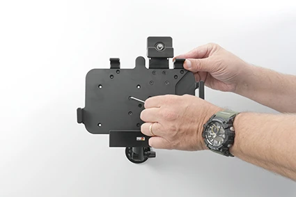 Attach the cradle onto any flat surface or Pedestal Mount in a forklift, truck, distribution vehicle, warehouse, table top etc. With 4 mm AMPS and 4 mm VESA 75 standard holes. Made of high grade ABS-, Acetal-plastic. Color: Black. Made in Sweden.