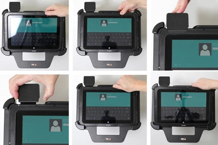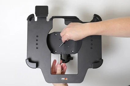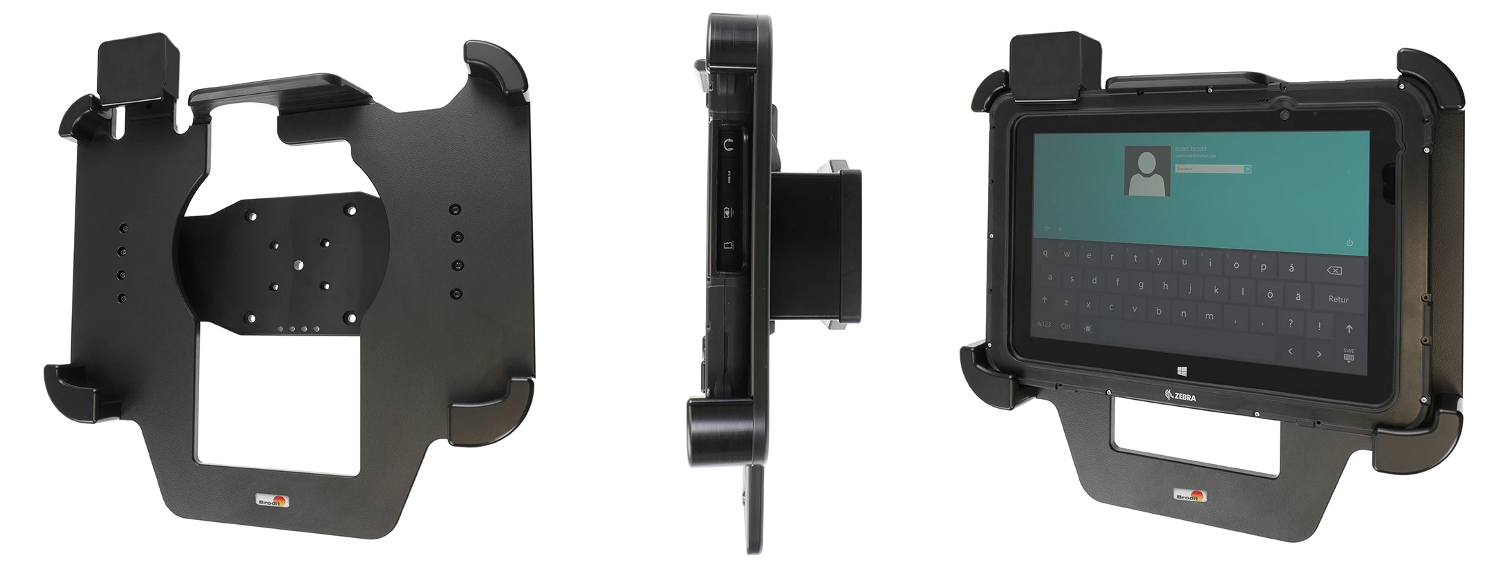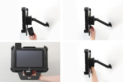 The holder with locking is to be used when you want to have your tablet extra firmly in place. The holder has a spring stud locking device, it keeps your device in a firm grip in the holder. You can connect e.g. a charging cable to the device when it is in the holder.