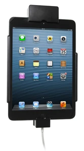 The holder can, combined with an Apple cable, be used for charging your iPad. First you mount the cable into place onto the holder, then it connects automatically to your iPad every time you place the device in the holder.