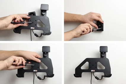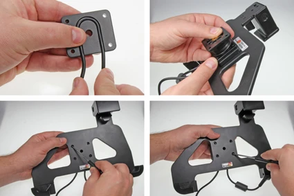 Place the charging cable into the milled groove on the backplate; making sure there is enough cable left to attach the charging pin into the device. Place the backplate between the tilt swivel and the holder, aligning the holes. Screw the pieces together using the enclosed screws.
