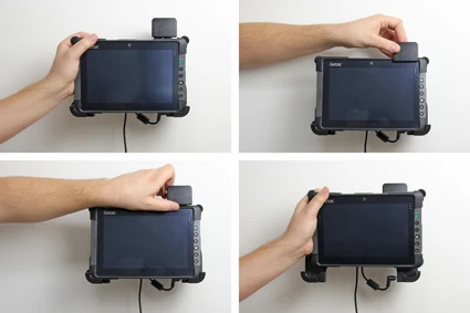 The holder is made of extra strong plastic and is equipped with a spring stud locking device. The holder is mounted onto a tilt swivel. This mean that you can adjust the angle in order to avoid light reflection on the screen. You can easily switch between portrait and landscape mode by turning the holder into desired position. Onto the holder you can attach Getac original cig-plug cable (P/N: 441830700002 R00).