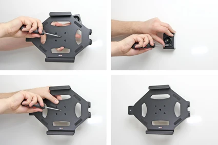 Loosen the screw in the center of the holder so you can remove the tilt swivel attaching plate on the back. Place the attaching plate onto the desired position. Screw the attaching plate into place with the enclosed screws. Place the holder over the attaching plate so the screw fits in the hole in the tilt swivel. Screw the holder onto the attaching plate. Tighten the screw so the holder is firmly in place, but still can be adjusted.