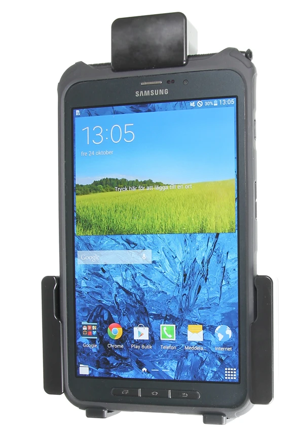 The holder with locking is to be used when you want to have your tablet extra firmly in place. The holder has a spring stud locking device, it keeps your device in a firm grip in the holder. You can connect e.g. a charging cable to the device when it is in the holder.