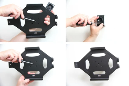 Loosen the screw in the center of the holder so you can remove the tilt swivel attaching plate on the back. Place the attaching plate onto the desired position. Screw the attaching plate into place with the enclosed screws. Place the holder over the attaching plate so the screw fits in the hole in the tilt swivel. Screw the holder onto the attaching plate. Tighten the screw so the holder is firmly in place, but still can be adjusted.