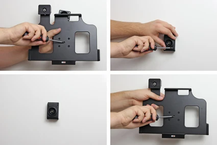 Loosen the screw in the center of the holder so you can remove the tilt swivel attaching plate on the back. Place the attaching plate onto the desired position. Screw the attaching plate into place with the enclosed screws. Place the holder over the attaching plate so the screw fits in the hole in the tilt swivel. Tighten the screw until the holder is firmly in place, but still can be adjusted.