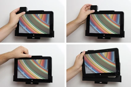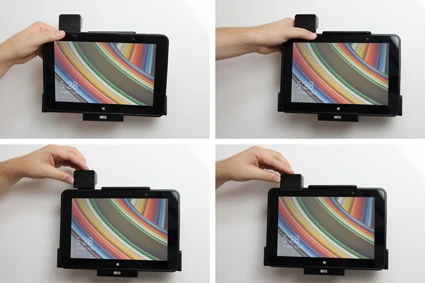 The holder is mounted onto a tilt swivel. This mean that you can adjust the angle in order to avoid light reflection on the screen. You can easily switch between portrait and landscape mode by turning the holder into desired position. It is easy to put the surfpad into place in the holder, and to take it with you when leaving the car.