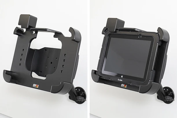 The holder with locking is to be used when you want to have your tablet extra firmly in place. The holder has a spring stud locking device, it keeps your device in a firm grip in the holder. You can connect e.g. a charging cable to the device when it is in the holder.