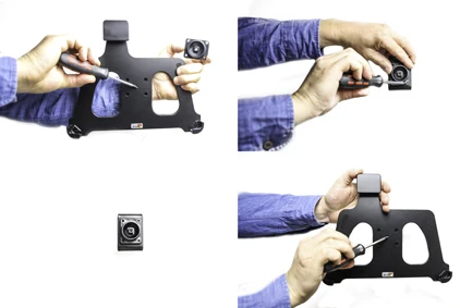 Loosen the screw in the center of the holder so you can remove the tilt swivel attaching plate on the back. Place the attaching plate onto the desired position. Screw the attaching plate into place with the enclosed screws. Place the holder over the attaching plate so the screw fits in the hole in the tilt swivel. Tighten the screw until the holder is firmly in place, but still can be adjusted.