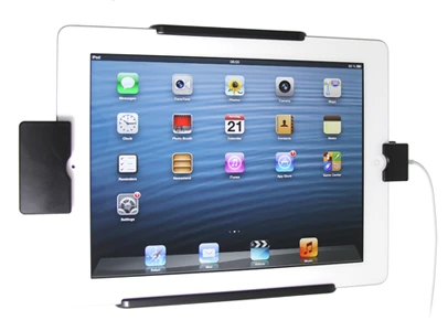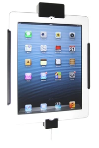 The holder can, combined with an Apple cable, be used for charging your iPad. First you mount the cable into place onto the holder, then it connects automatically to your iPad every time you place the device in the holder.
