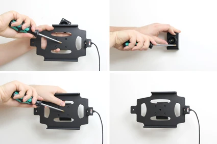 The holder is made of extra strong plastic and is equipped with a spring stud locking device. The holder is mounted onto a tilt swivel. This mean that you can adjust the angle in order to avoid light reflection on the screen. You can easily switch between portrait and landscape mode by turning the holder into desired position.