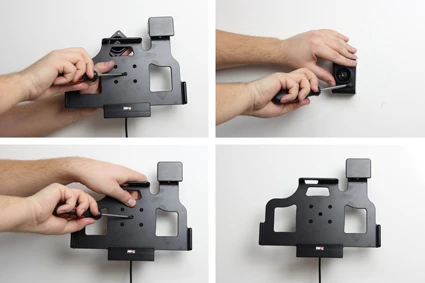 Loosen the screw in the center of the holder so you can remove the tilt swivel attaching plate on the back. Place the attaching plate onto the desired position. Screw the attaching plate into place with the enclosed screws. Place the holder over the attaching plate so the screw fits in the hole in the tilt swivel. Tighten the screw until the holder is firmly in place, but still can be adjusted.