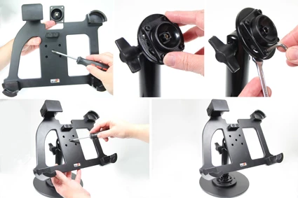 The holder is equipped with a tilt swivel so you can easily adjust the angle for better viewing, or switch between portrait and landscape mode. Tilts 15° and swivels 360°. Mounting plate 42x50 mm with predrilled AMPS-holes. Made in Sweden. Made of high grade ABS and Acetal plastic. Color: Black. Devices should not be installed onto a vehicle's dashboard if blocking the view or key controls. An installation of a device in a vehicle is always done on the customer's own responsibility.
