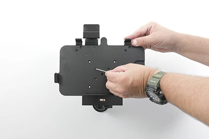 Attach the cradle onto any flat surface or Pedestal Mount in a forklift, truck, distribution vehicle, warehouse, table top etc. With 4 mm AMPS and 4 mm VESA 75 standard holes. Made of high grade ABS-, Acetal-plastic. Color: Black. Made in Sweden.