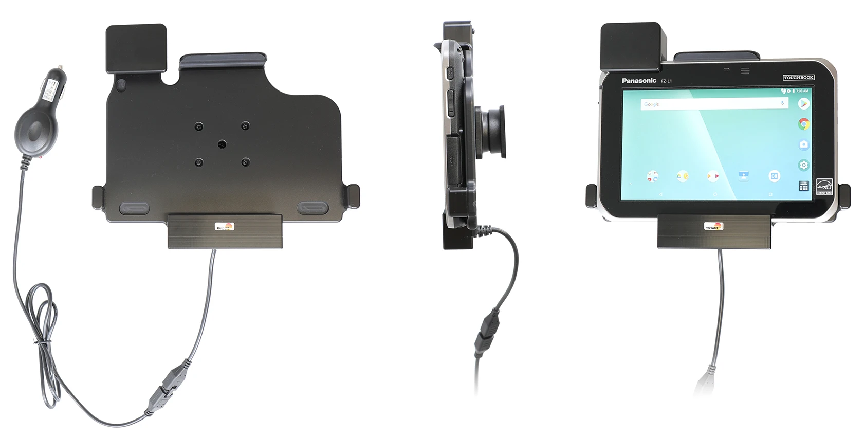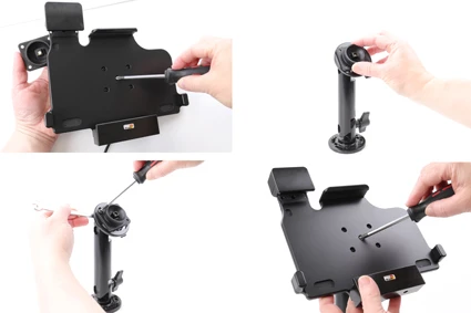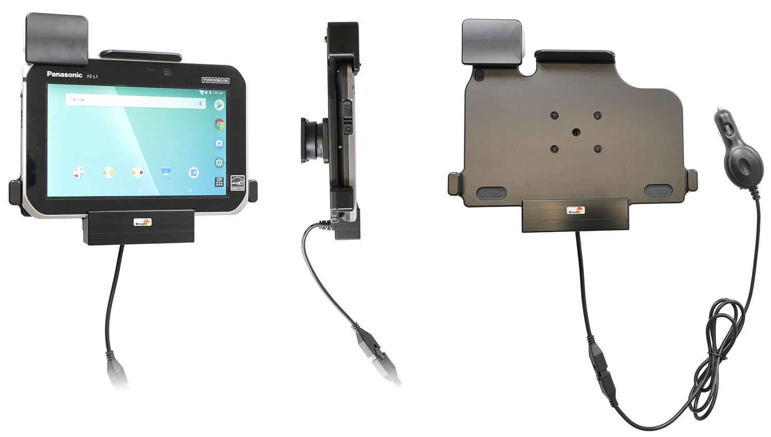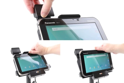 The active holder guarantees a newly charged battery at all times. 2 A charging. Charging via pogo plug. The holder is equipped with a spring stud locking device. The holder is mounted onto a tilt swivel. This mean that you can adjust the angle in order to avoid light reflection on the screen. You can easily switch between portrait and landscape mode by turning the holder into desired position.