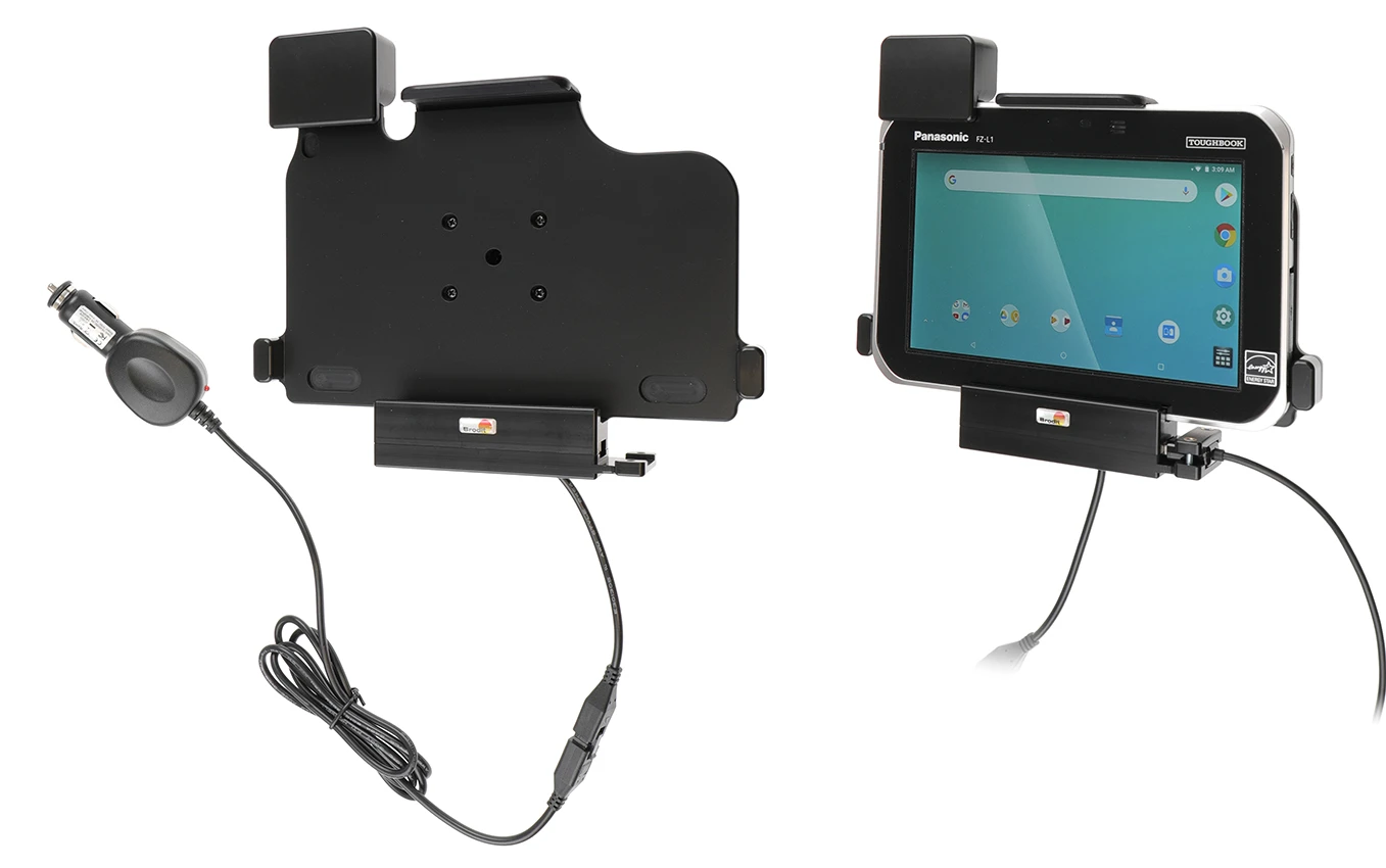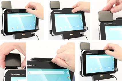 The active holder guarantees a newly charged battery at all times. 2 A charging. Charging via pogo plug. The holder is equipped with a spring stud locking device. The holder is mounted onto a tilt swivel. This mean that you can adjust the angle in order to avoid light reflection on the screen. You can easily switch between portrait and landscape mode by turning the holder into desired position.