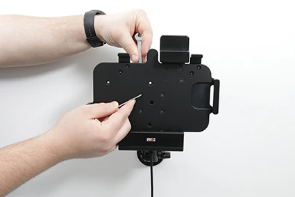 Attach the cradle onto any flat surface or Pedestal Mount in a forklift, truck, distribution vehicle, warehouse, table top etc. Backplate made of steel with 4 mm AMPS and 4 mm VESA 75 standard holes. Made of high grade ABS-, Acetal-plastic and metal. Color: Black. Made in Sweden.