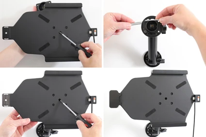 Loosen the screw in the center of the holder so you can remove the tilt swivel attaching plate on the back. Place the attaching plate onto the desired position. Screw the attaching plate into place with the enclosed screws. Place the holder over the attaching plate so the screw fits in the hole in the tilt swivel. Screw the holder onto the attaching plate. Tighten the screw so the holder is firmly in place, but still can be adjusted.