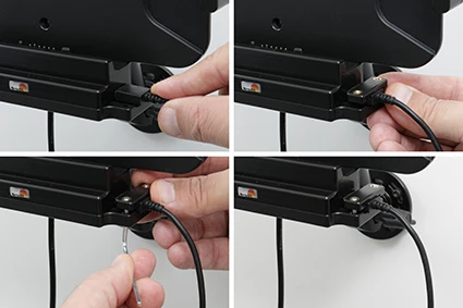 Connect device via USB Host. Press the cable into the socket, place the cable socket over the pre-drilled holes, screw the cable socket with the enclosed screws.