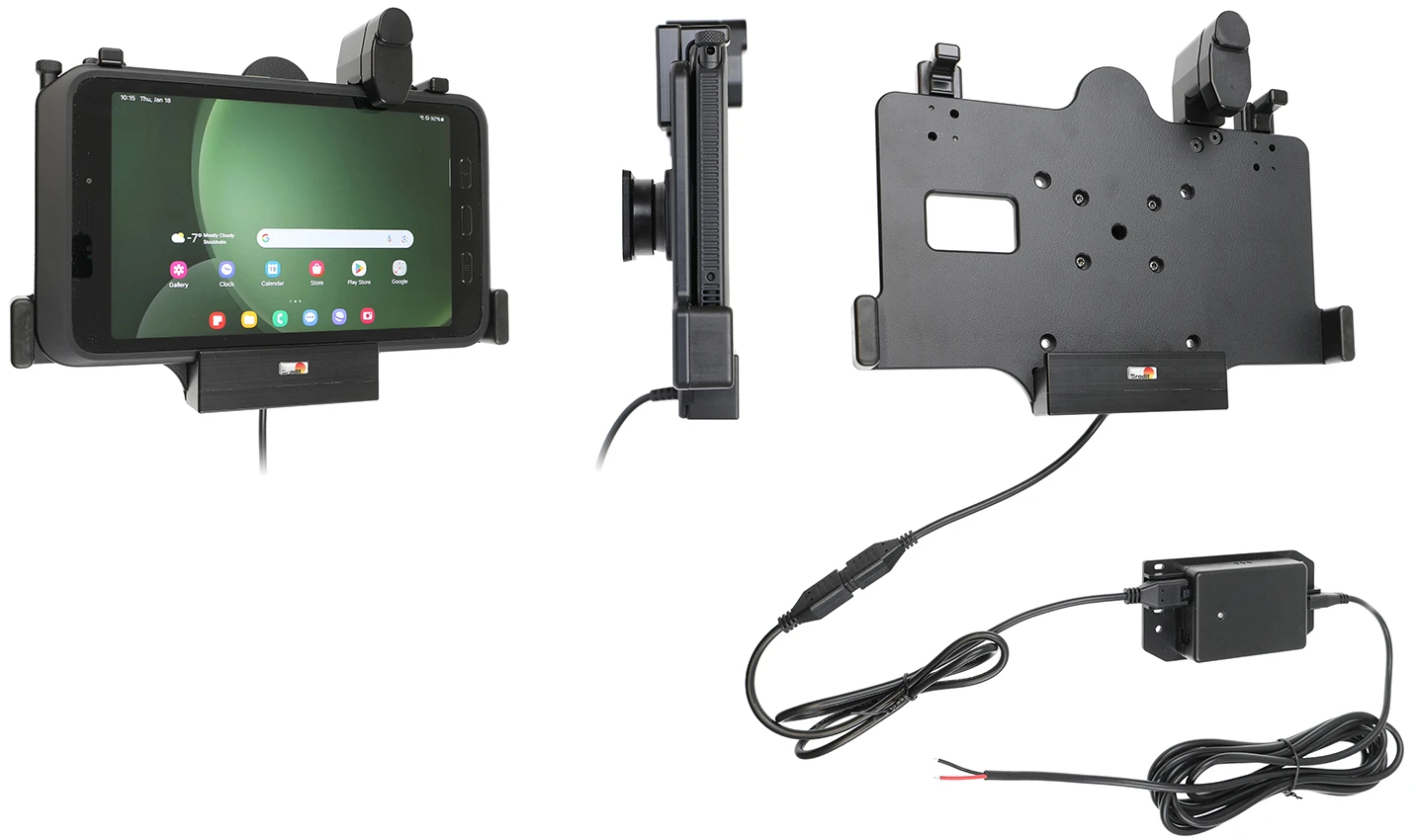 The active holder is to be connected inside the dashboard. It provides a discreet and neat installation without any cables hanging over the interior. Safe and convenient! 12/24 Volt. The product is E-approved. Connect the power cable with a 2A fuse. 2,5A charger. Charging via pogo plug. Professional installation recommended.