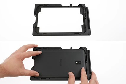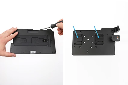 Place the backplate over the tablet and secure it using the 10 included T10 Torx screws. The two mount points on the ModTek Dock (Sold seperately) are used to align the tablet with the USB-C connector to ensure a perfect alignment and ensure the USB-C connection to the tablet does not create excessive wear.