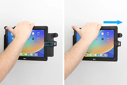 Releasing a Hard Case from the Dock: Use the quick release dial by turning it clockwise similar to turning a key. Now grab the Hard Case and slide it untill you see the allignment line and then pull the case towards you.