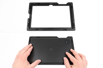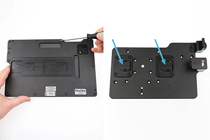Place the backplate over the tablet and secure it using the 10 included T10 Torx screws. The two mount points on the ModTek Dock (Sold seperately) are used to align the tablet with the USB-C connector to ensure a perfect alignment and ensure the USB-C connection to the tablet does not create excessive wear.