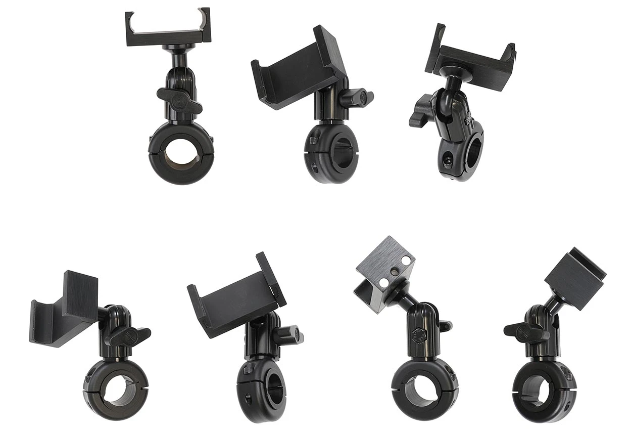 Stable motorcycle mount with mobile holder for attachement on the handlebar. The mount has two joints so you can easily adjust the angle and lock it in the desired position with the wingnut. The piedestal part is 40 mm long and turns 360°. Total length 107 mm. Fits motorcycle handlebars with diameter 20-32mm. May also be used on bicycles, electric bicycles and other round pipes/tubes with the diameter 20-32 mm.