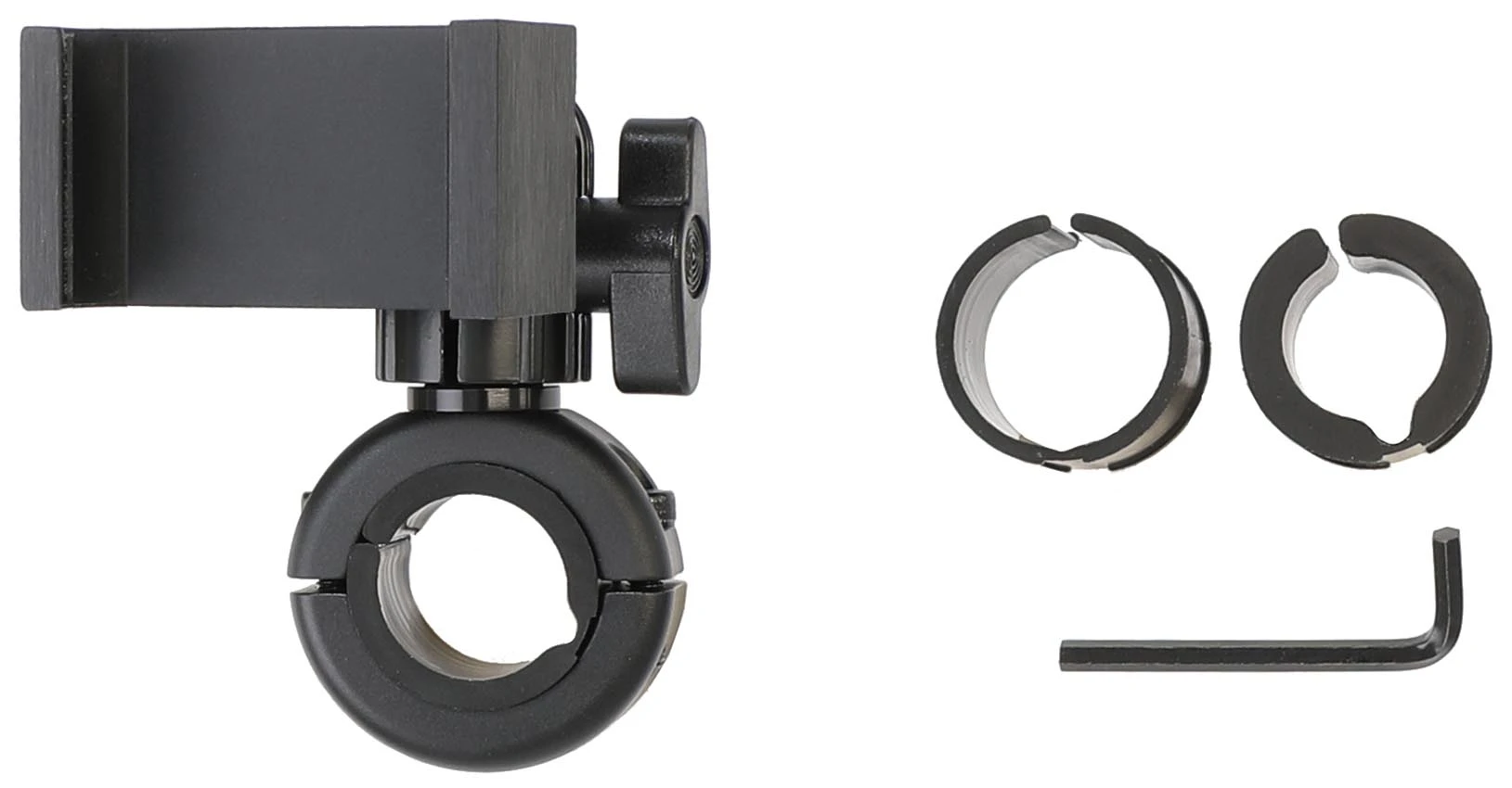 The holder is adjustable and fits mobile phones that are 56-92 mm wide. Easy one-hand insertion and removal. The mobile phone is held firmly in place on the road (not for offroad use). The holder turns 360° and tilts 220°. Color: black.