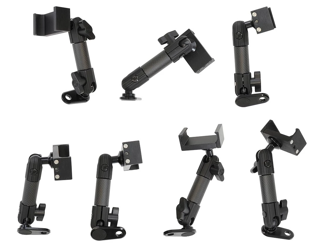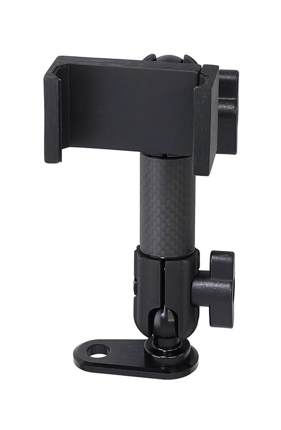 Stable motorcycle mount with mobile holder for attachment in the same mounting point used for the side mirror. The mount has two joints so you can easily adjust the angle and lock it in the desired position with the wingnut. The piedestal part is 123 mm long and turns 360°. Total length 141 mm. Fits motorcycle handlebars with a side mirror mount for 10 mm bars.
