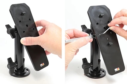Screw the mount with the included screw into the hole at the bottom as shown in the picture.