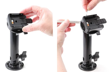 To install the Quick Release Dock: Place the Quick Release Dock over your mounting location (demo ProClip pedestal shown in photo). Secure it in place using the appropriate hardware for the center hole or the AMPS compatible hole pattern.