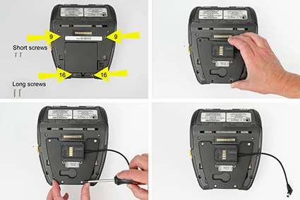 Location of the screws before mounting, LONG screws 16mm, SHORT screws 9mm. Place the mount onto the device so the holes match. Screw the two enclosed LONG screws in place in the holes shown in the picture. Screw the two enclosed SHORT screws in place in the holes shown in the picture.