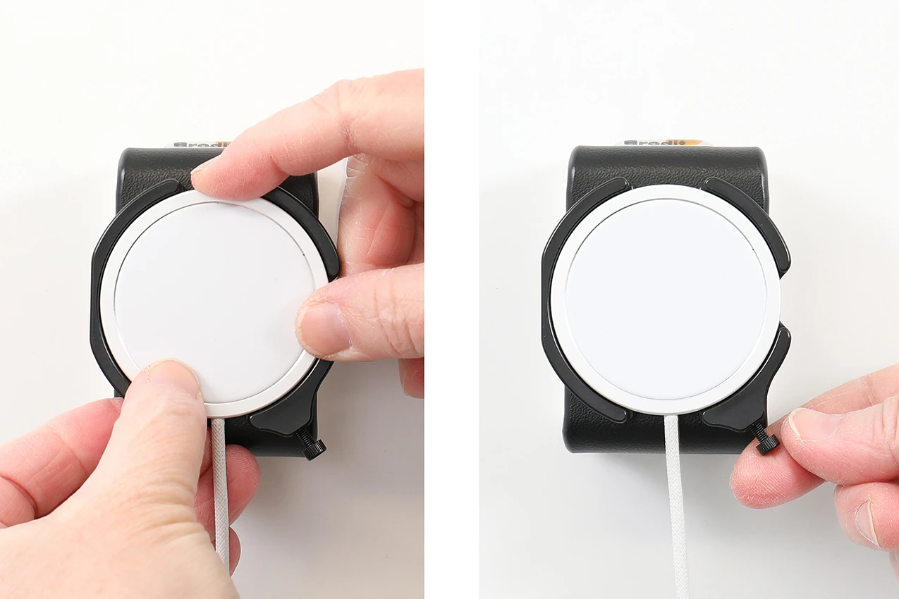 The mount is in place. The mount to hold an Apple MagSafe Charger is designed for use in ordinary driving conditions. Please be aware that in certain situations, such as driving on bumpy roads or a sudden braking/maneuvering of a vehicle, it is possible that the Apple MagSafe Charger device may be dislodged from the mount holding it. Use of the mount holding an Apple MagSafe Charger is at the user’s sole discretion and risk. Brodit AB is not responsible for any damage caused by a device being dislodged from the mount holding a MagSafe Charger.