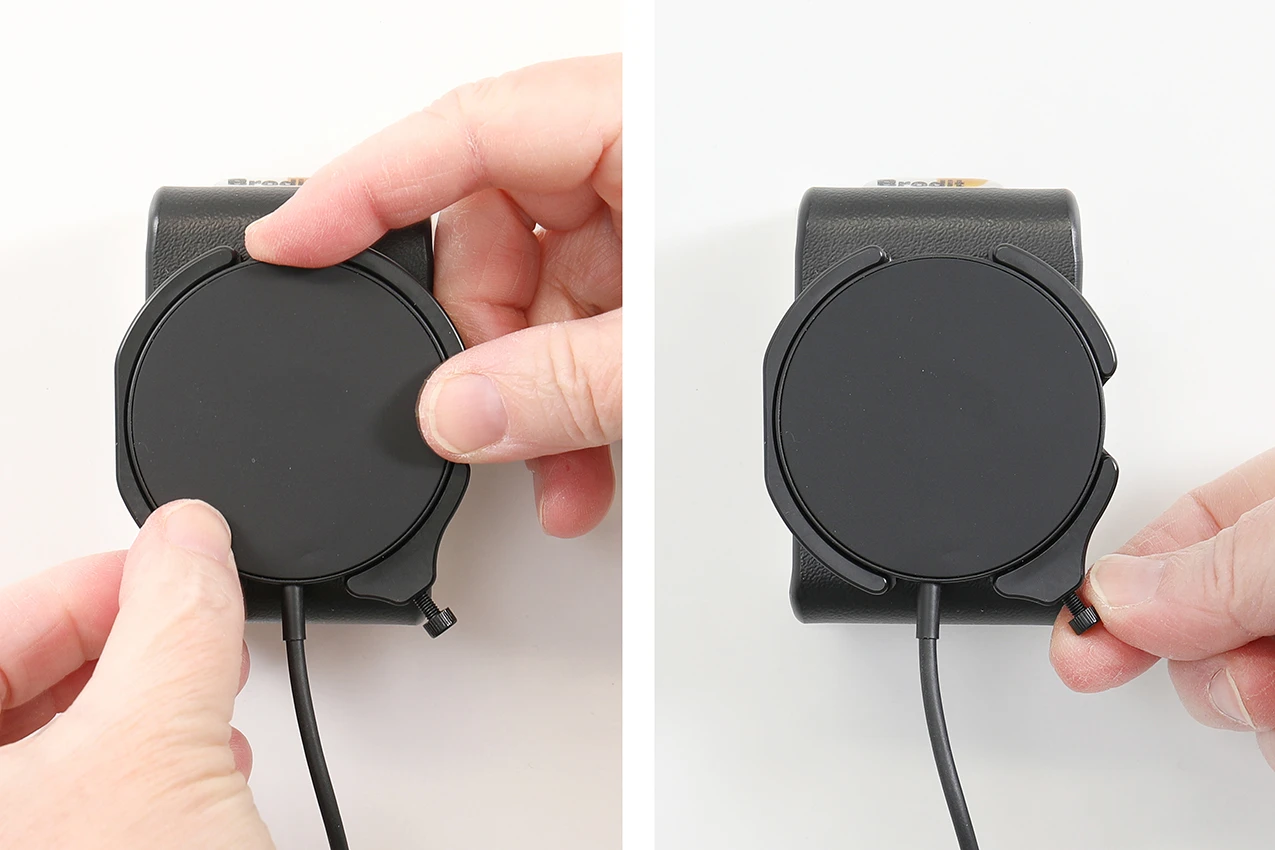 The mount is in place. The mount to hold an Magnetic charger is designed for use in ordinary driving conditions. Please be aware that in certain situations, such as driving on bumpy roads or a sudden braking/maneuvering of a vehicle, it is possible that the Magnetic charger device may be dislodged from the mount holding it. Use of the mount holding an magnetic charger is at the user’s sole discretion and risk. Brodit AB is not responsible for any damage caused by a device being dislodged from the mount holding a Magnetic charger.