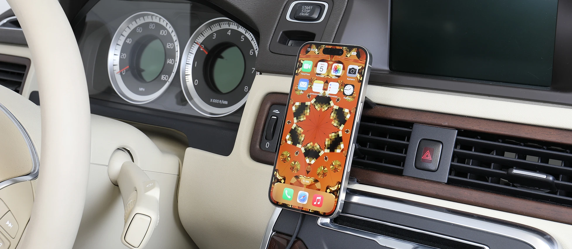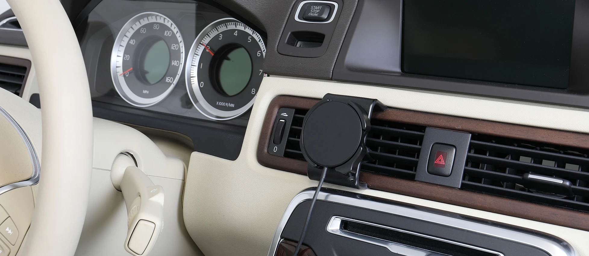 Keep your iPhone battery fully charged in a mount with Magnetic wireless charger, always within easy sight and reach! Neat, discreet and convenient. Custom made with a perfect, firm fit. The iPhone is held securely in place in an upright position for maximum cellular reception. Cig-plug adapter with 2 USB ports includes.