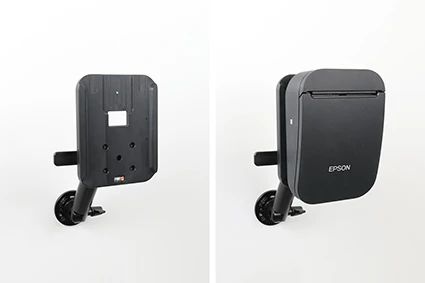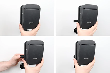 Place the printer next to the mounting plate, push it in until you hear a click. To release the printer press in the locking lever, push the printer to the side until it comes free.