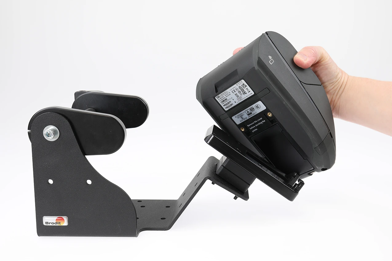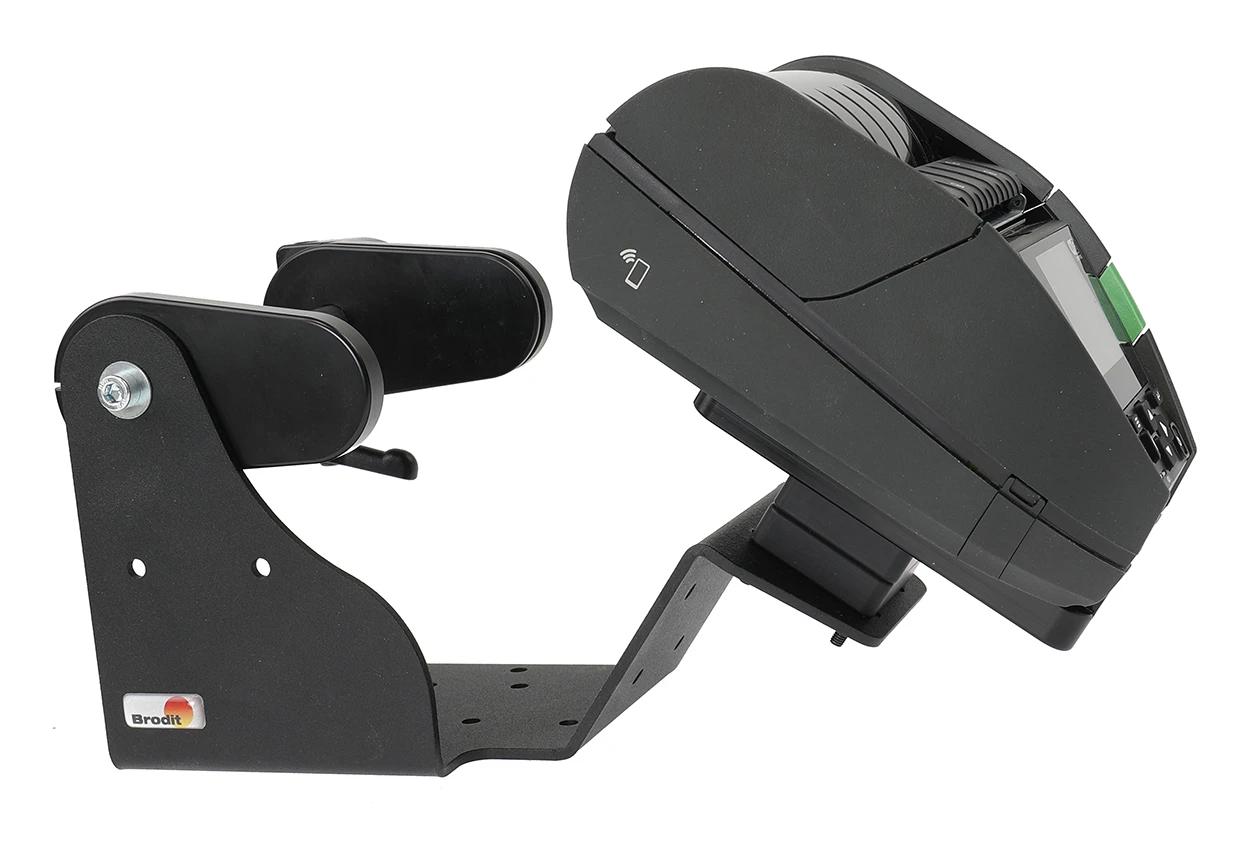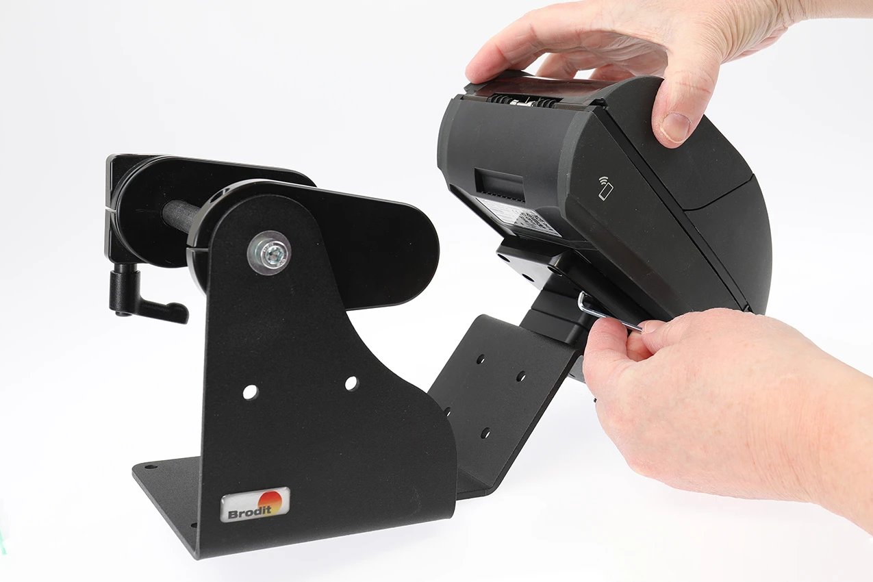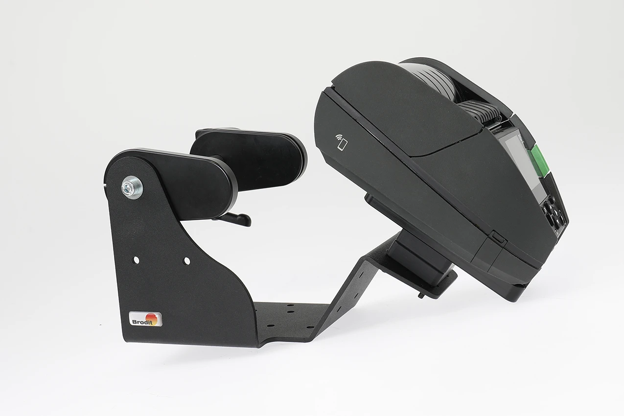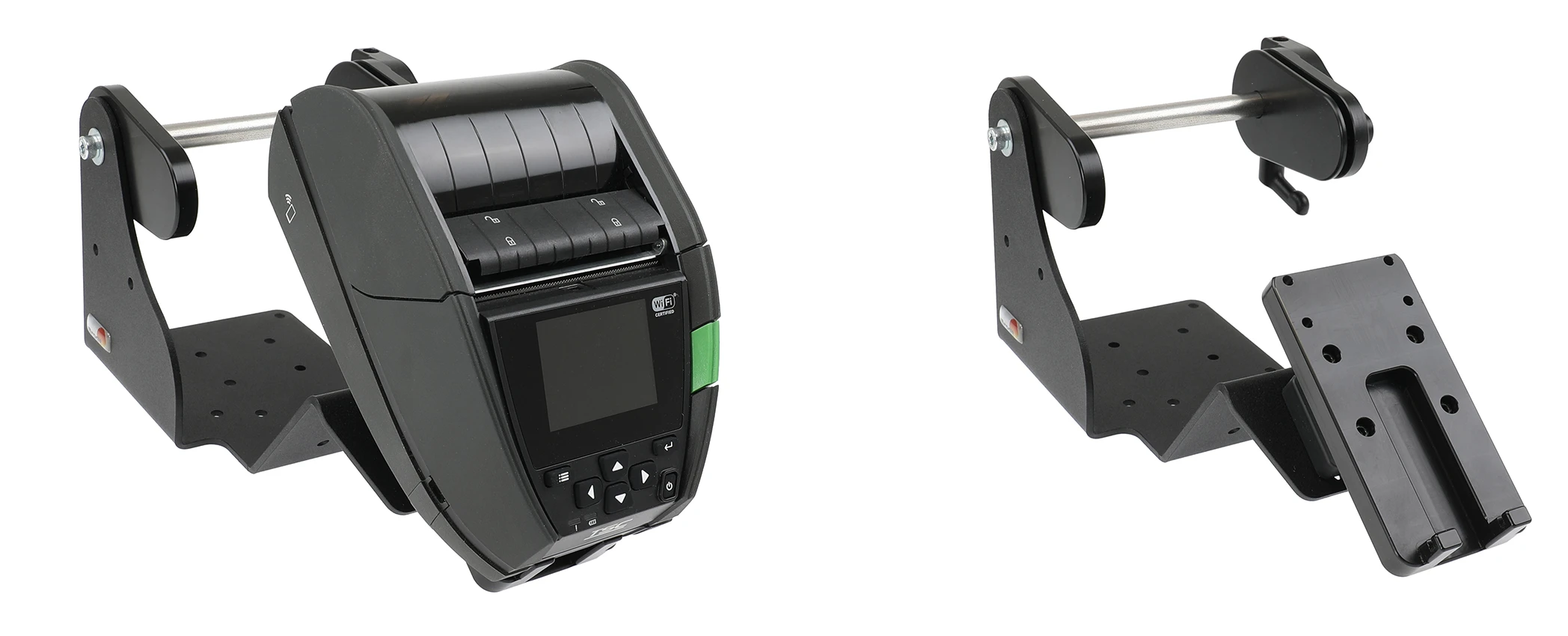 This printer mount offers an easy and secure way to mount your printer and includes an external roller for large rolls of labels or media. When combined with a printer mount plate this platform provides a flexible mount that utilizes the continuous feed rollers for printing platforms.