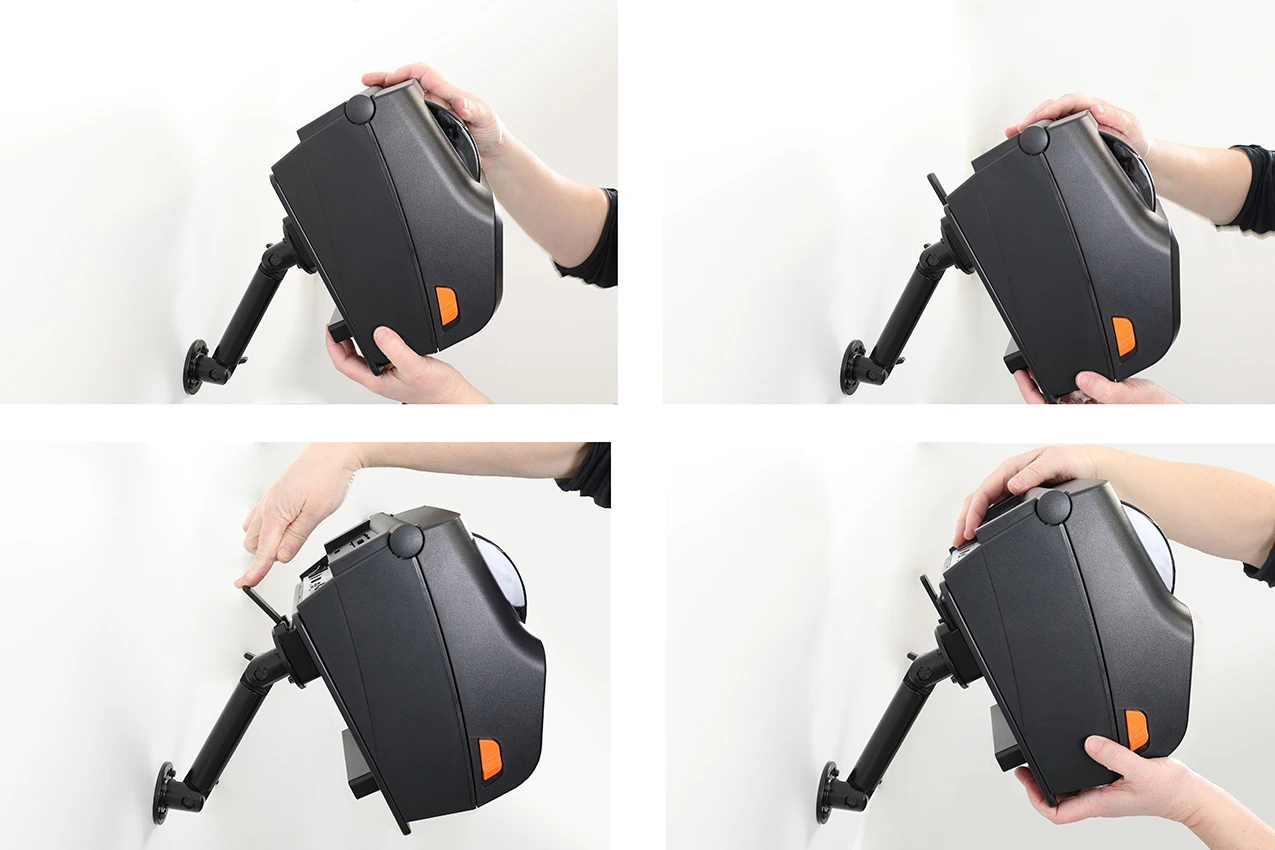 Put the device into place: Hold the device over the MultiMoveClip. Press it downwards onto the MultiMoveClip so it snaps into place. Remove the device: Press forward on the release lever and slide the device upwards away from the MultiMoveClip.