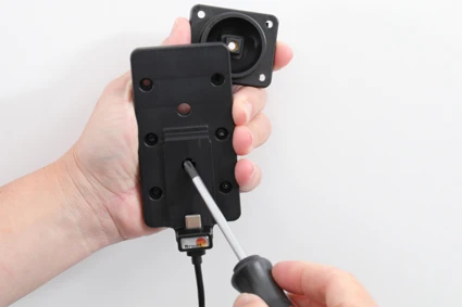 The holder is equipped with a tilt swivel so you can easily adjust the angle for better viewing, or switch between portrait and landscape mode. Tilts 17° and swivels 360°. Mounting plate 42x50 mm with 4 mm AMPS-holes. Made of high grade black ABS/Acetal plastic. Made in Sweden. Color: black. Connect the power cable with a 2A fuse. Professional installation recommended. Attach onto a ProClip mounting platform.