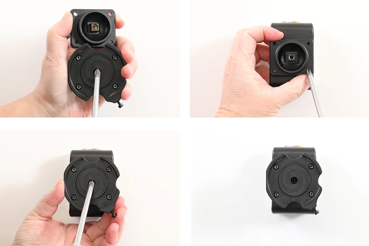 Loosen the screw in the center of the mount so you can remove the tilt swivel attaching plate on the back. Place the attaching plate onto the desired position. Screw the attaching plate into place with the enclosed screws. Place the mount over the attaching plate so the screw fits in the hole in the tilt swivel and screw it into place. Tighten the screw so the mount is firmly in place, but still can be adjusted.
