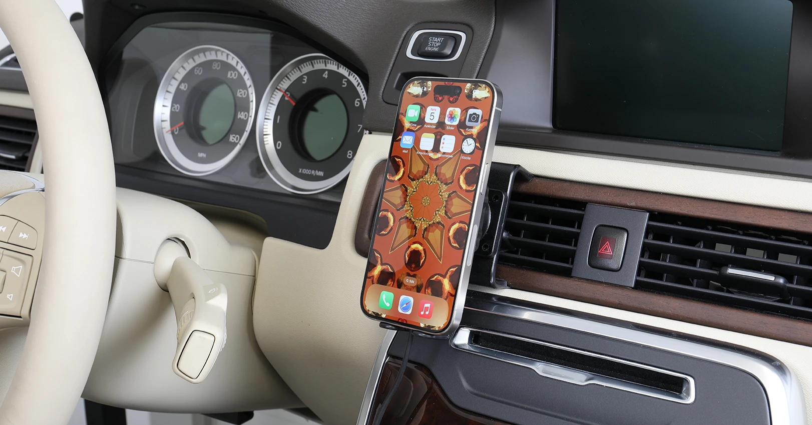 Keep your iPhone battery fully charged in a mount with Magnetic wireless charger, always within easy sight and reach! Neat, discreet and convenient. Custom made with a perfect, firm fit. The iPhone is held securely in place in an upright position for maximum cellular reception. The Mount is equipped with an support under the device. Cig-plug adapter with 2 USB ports includes.