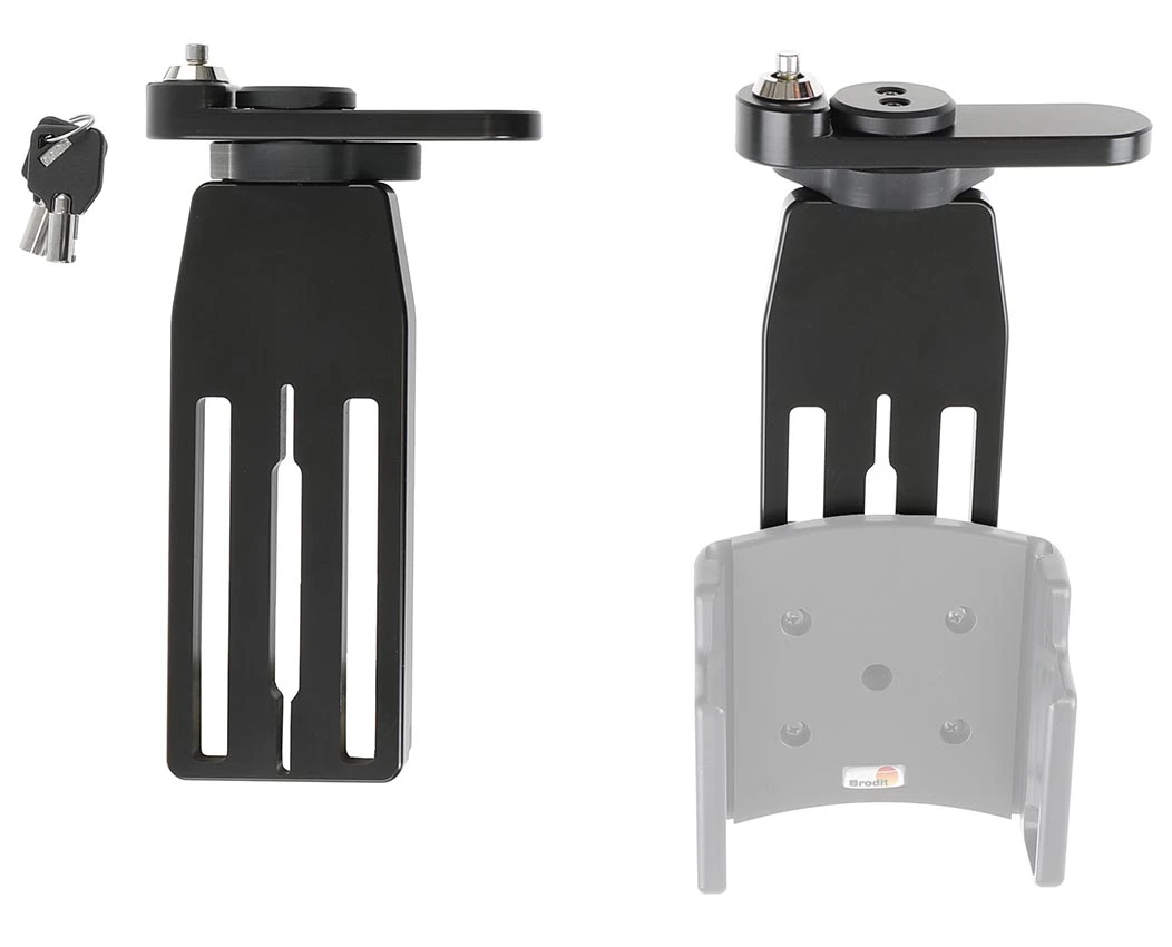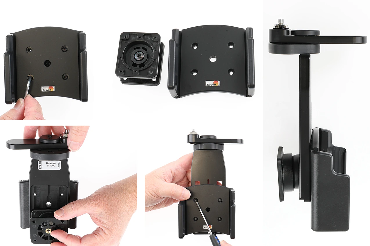 You mount the top support on the back of your holder and adjust the height to suit your device. Fits all Brodit holders that have a tilt swivel plate in the size 42x50 mm. (depending on the design of the device). Made of ABS/Acetal plastic. Color: black. Made in Sweden.