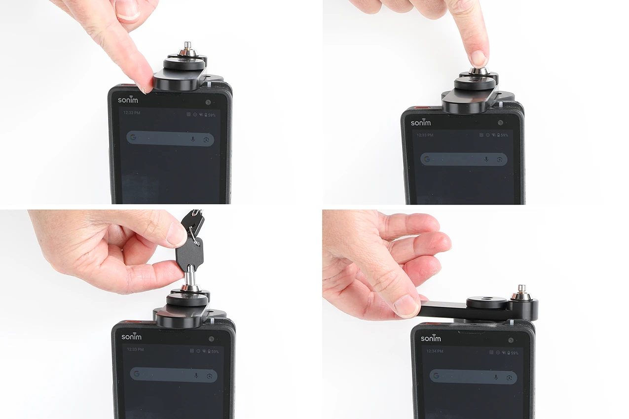 To place the device in the holder: Slide the device downwards into the holdere. Turn the swiveling top sideways onto the device so it holds the device in place. Press the button to lock. To remove the device from the holder: Unlock the lock by using the key. Turn the swiveling top sideways away from the device, so the device is set free. Lift the device upward and out of the holder.