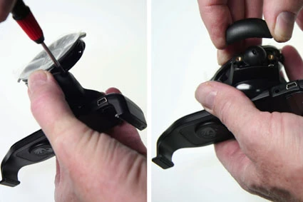 Remove the rubber covers to reveal the two screws holding the suction cup ball to the back of the holder. Unscrew the two screws and remove the lid to release the suction cup ball. Slide the suction cup ball out from the holder.